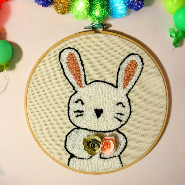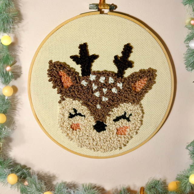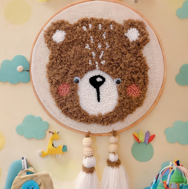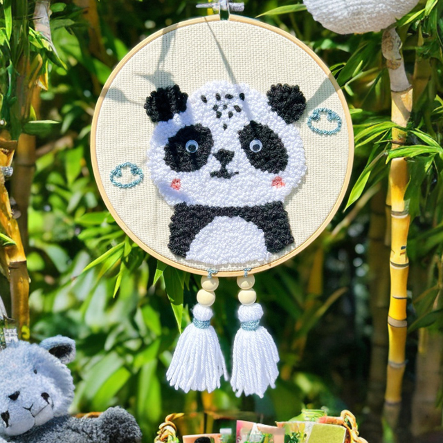 Décoration murale (tambour de 20cm) réalisée en punch needle, représentant un ours, un lama ou un panda.